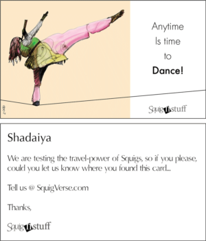 Drop Cards were invented for SquigVerse by a couple of forward-thinking long-lifers looking back and realizing TVOs (people and objects of ThisVerse) really needed a way to spread good thoughts, randomly (or not) wherever they go. So they came up with a card similar to the ones that TVOs pull out of their pockets and give to people they want to see again.